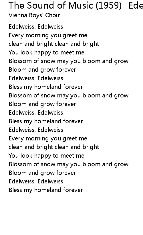 Sound of Music (sung by me): Text German: Edelweiß, Edelweiß, Du grüßt mich jeden Morgen, Sehe ich dich, Freue ich mich, . Edelweiss Lyrics are a theme that is being searched for and appreciated by netizens now. You can Download the Edelweiss Lyrics here. Save all royalty-free images. Edelweiss - Julie Andrews - The Sound Of Music, HD with Lyrics, By Giulia Zarantonello..